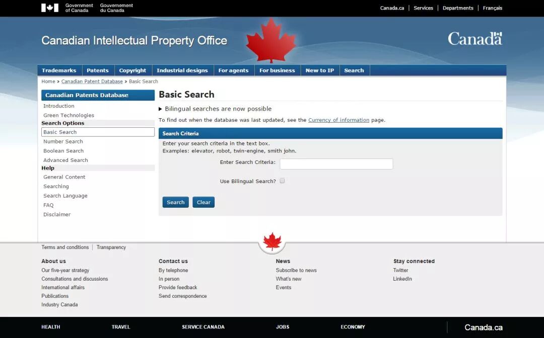登录地址:http://brevets-patents.ic.gc.ca/opic-cipo/cpd/eng/search/basic.html