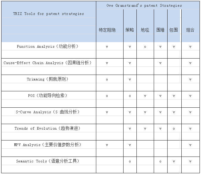 本文通过列出已知专利布局方案(Ove Granstrand &Sergei Ikovenko),通过与现代 TRIZ工具的比对,列出现代 TRIZ 工具可应用于专利布局(Ove Granstrand’s patent strategies)的工具作为布局时的思路参考。