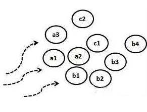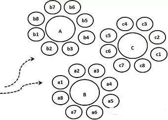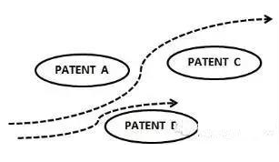 如图 2 所示特定的阻绝,Patent A/B/C 分别取得特定技术方案的权利范围,申请数量少,维护成本低,这种方式权利范围间存在空隙,竞争对手容易回避,而竞争对手回避所耗费的资源也可能不高。此种类型的专利布局重点不在于防止对手回避,而是如何取得相对优势的技术方案的权利范围。