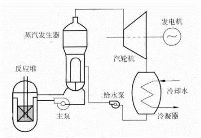 作为慢化剂和冷却剂的水,由压力容器侧面流入,从压力容器的下部转向180°后自下而上进入堆芯。冷却剂通过堆芯后吸收堆芯的释热,温度升高,密度降低,从堆芯上部流出压力容器。高温水从压力容器上部离开堆芯以后,进入蒸汽发生器,冷却剂从蒸汽发生器的管内流过后,经过冷却剂回路循环泵又回到反应堆堆芯。压水堆的热力系统示意图如图2。